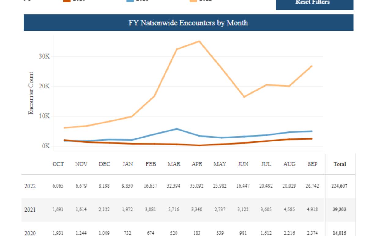 En amarillo se muestra la curva que corresponde a la ola migratoria de 2022. ( Departamento de Aduanas y Protección Fronteriza)