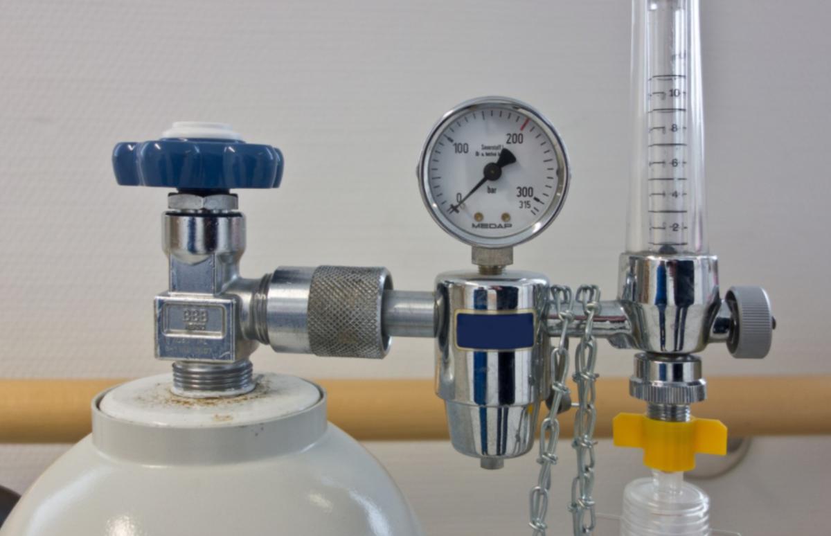 Cilindro y barómetros para suministrar oxígeno a enfermos. (Licencia creativa commons)